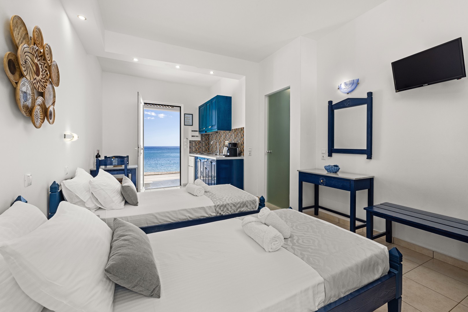 This studio offers sea views and free Wi-Fi. It includes a kitchenette with electric kettle, coffee maker and refrigerator. The bathroom is equipped with a shower and a hairdryer. Ground floor studios have a terrace, while those on the upper floors offer a balcony. *for an extra child up to 12 y/o please contact us.