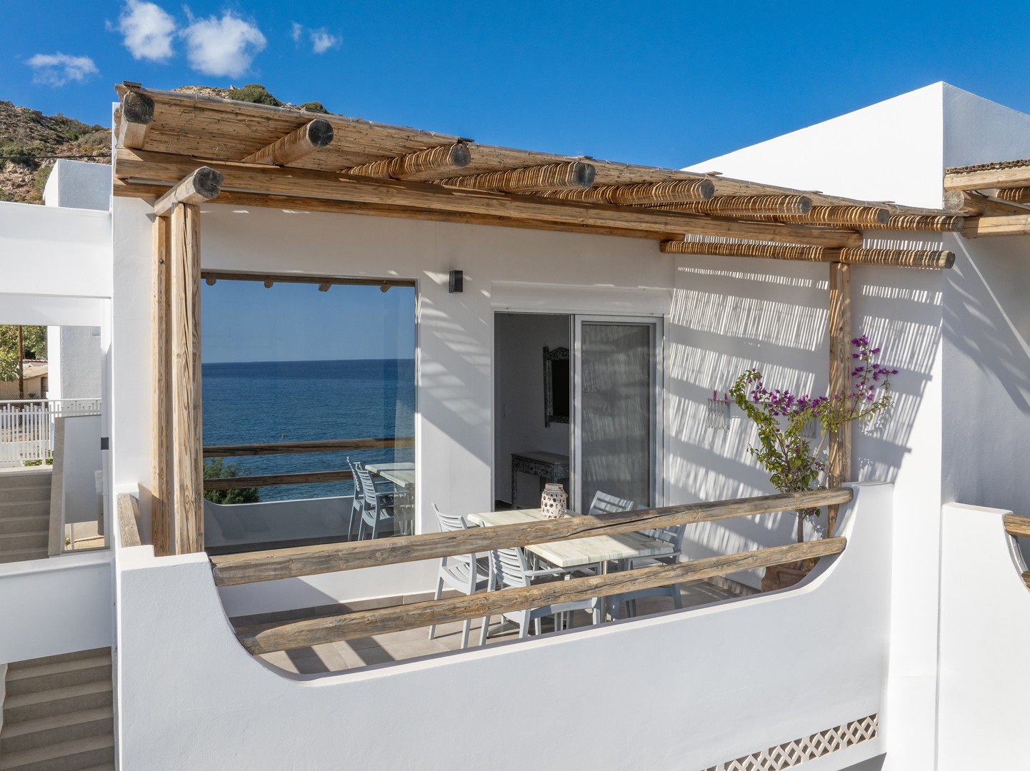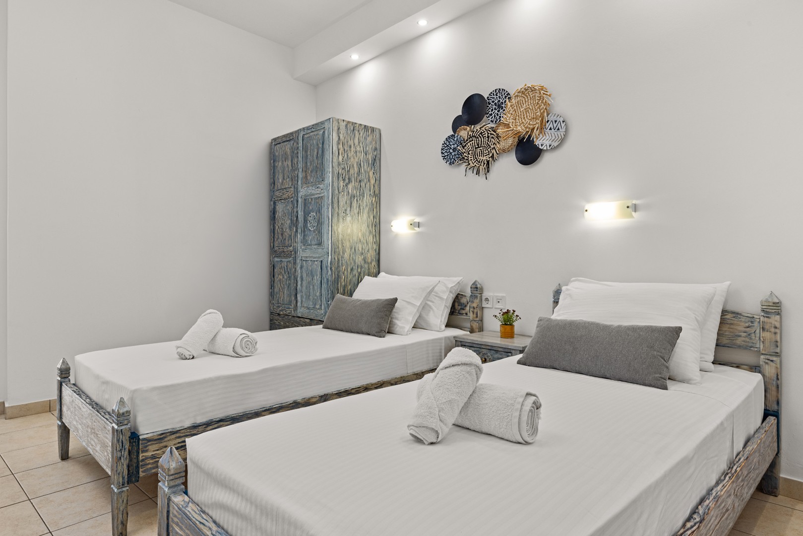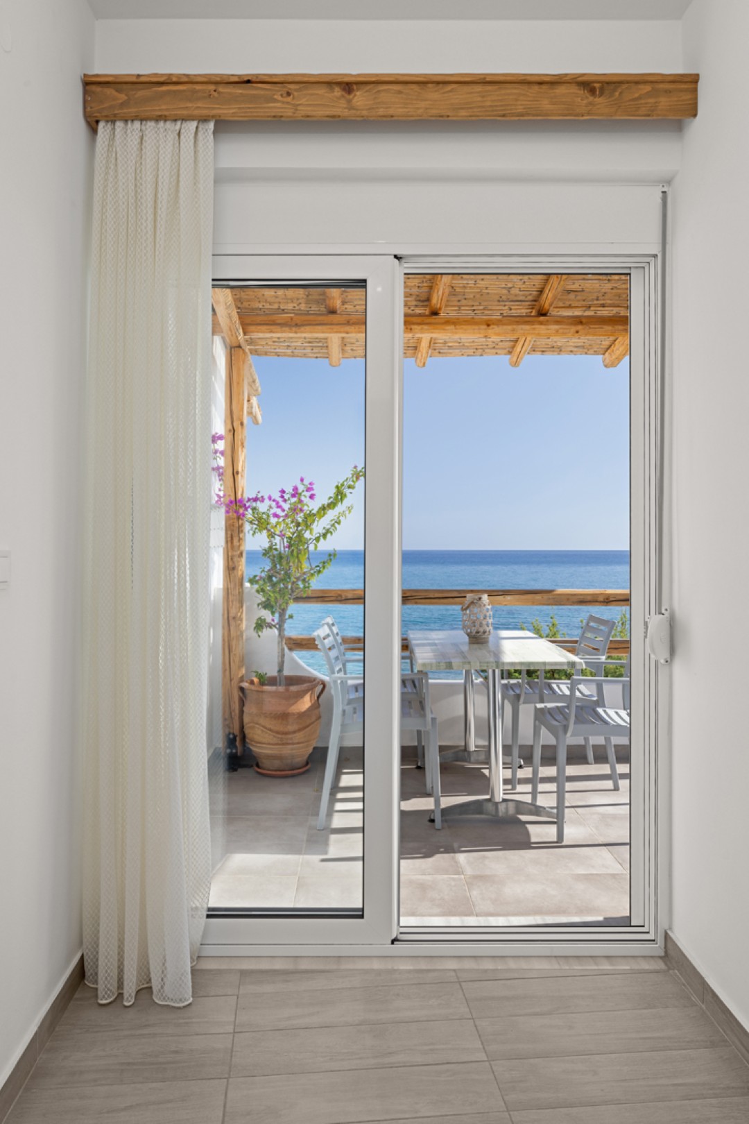 This Suite offers a view of the endless blue. It has two bedrooms, one with a large double bed. And the other room with two single beds. It includes a kitchen with all utensils, electric kettle, coffee maker, toaster and fridge. The bathroom is equipped with a shower and a hairdryer, those on the upper floors have large balconies. With private entrance.