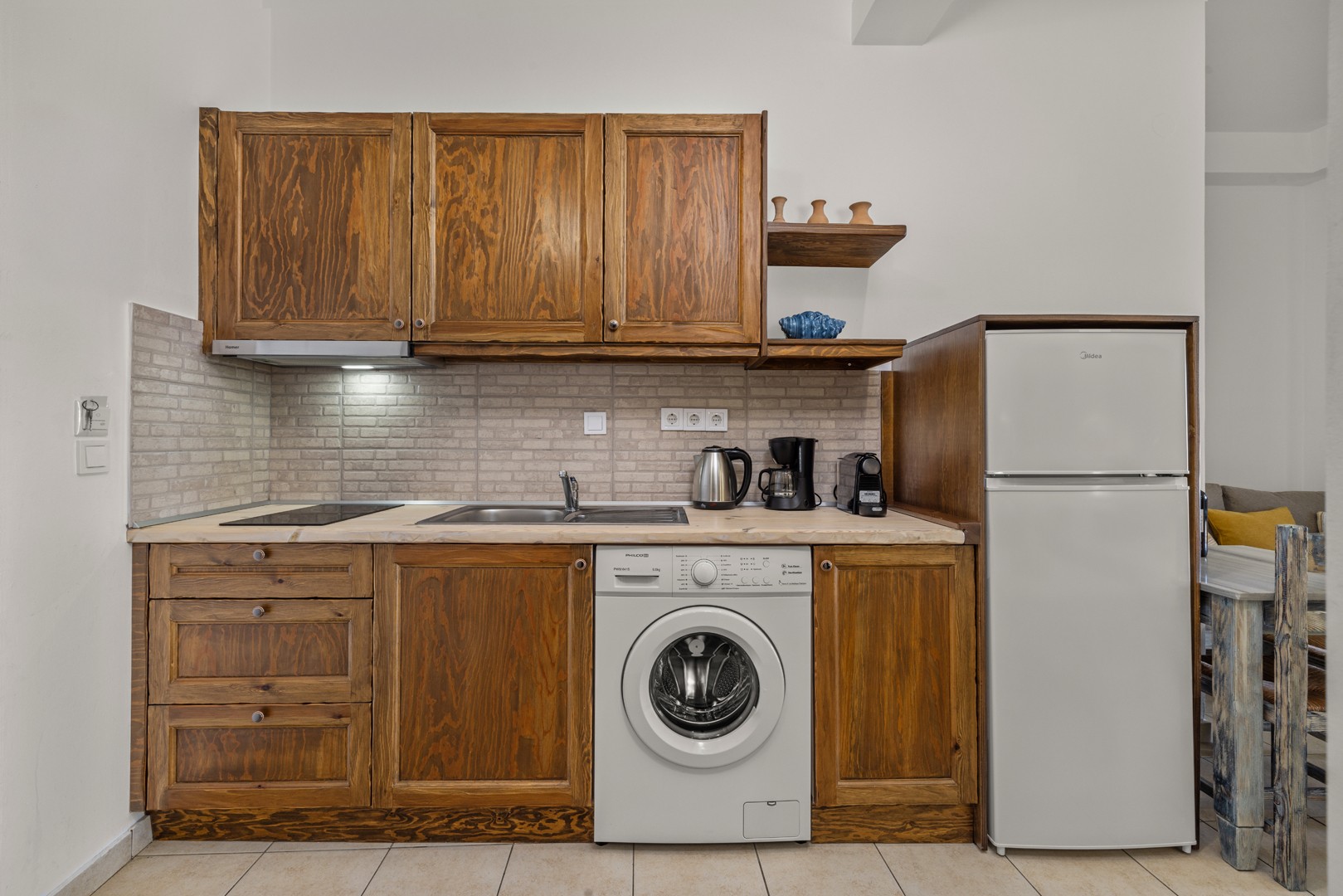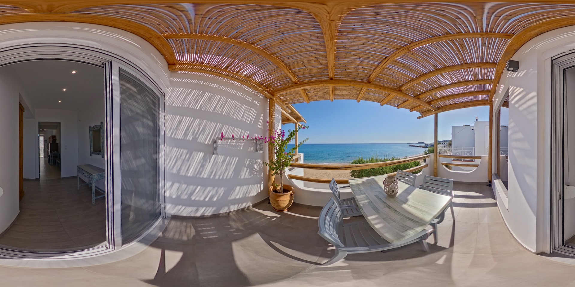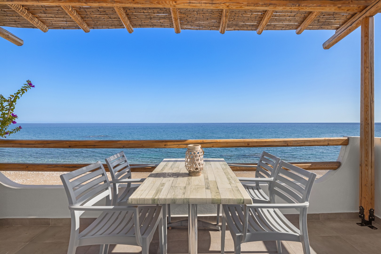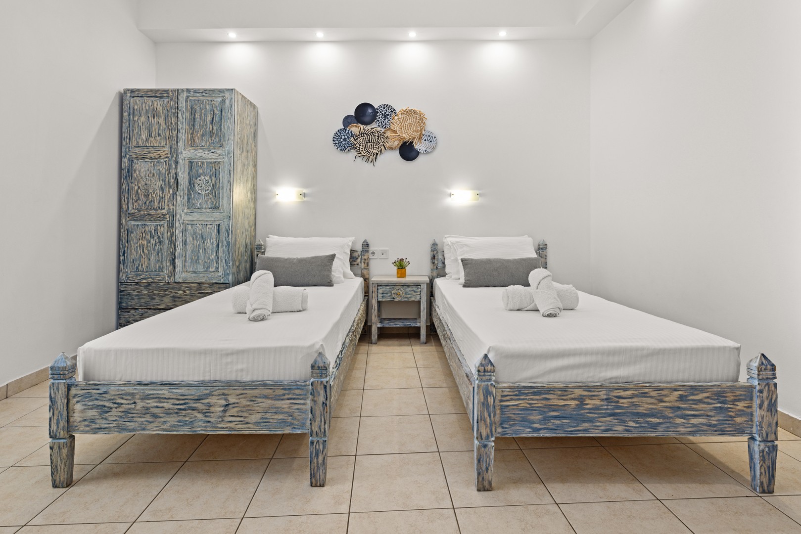 This Suite offers a view of the endless blue. It has two bedrooms, one with a large double bed. And the other room with two single beds. It includes a kitchen with all utensils, electric kettle, coffee maker, toaster and fridge. The bathroom is equipped with a shower and a hairdryer, those on the upper floors have large balconies. With private entrance.